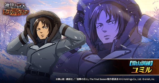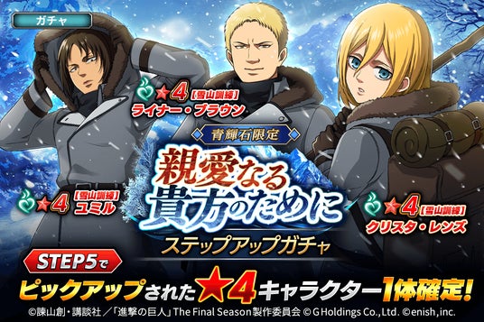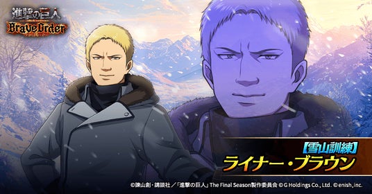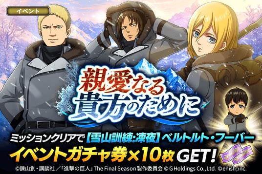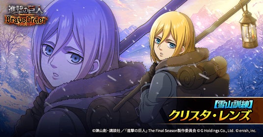 株式会社enish(本社:東京都港区、代表取締役社長:安徳 孝平、以下enish)は、アニメ『進撃の巨人』のスマートフォンゲーム最新作「進撃の巨人Brave Order」にて、2025年2月27日(木)より、「親愛なる、貴方のために」を開催!また、本日より新登場の【雪山訓練】クリスタ・レンズ、【雪山訓練】ユミル、【雪山訓練】ライナー・ブラウンがピックアップされた「親愛なる、貴方のためにガチャ」も開催!その他、最新情報はゲーム公式サイト・ゲーム公式X(旧Twitter)アカウントにて随時公開して行きますので、ぜひご覧ください。
