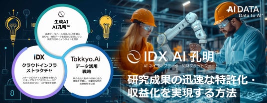 一方、知財インフラでは、グループ会社の特許検索・出願支援システム『Tokkyo.Ai』や特許売買を可能にするIPマーケットプレイスの構築により、知財管理と収益化を支援。これらを統合し、生成AI『AI孔明』によるデータと知財の融合プラットフォームを展開しています。