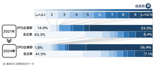その結果、分析が可能な全24万社と比較して、IPO企業では高いポテンシャルが数値として現れる結果となった。2024年12月時点において、3年後に売上高が1.5倍以上になる可能性が最も高い「SPレベル10」の割合は、全企業では7.1%だったのに対して、2024年IPO企業群では56.4%と全企業の約8倍にのぼった。IPOする3年前である2021年以降、各時点のいずれも同様の結果がみられている。