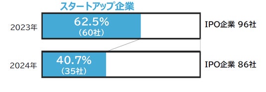 2024年IPO企業86社のうちスタートアップ企業[1]は35社と、全体の40.7%を占めた。スタートアップ企業の「出口戦略」(イグジット、EXIT)の手法としてIPOが代表的と言われているが、その割合は前年(62.5%)から21.8ポイント低下する結果となった。その背景に、スタートアップ企業が多く上場する東証グロース市場の継続的な低迷などによるIPOの延期が考えられる。