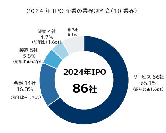 こうした市場環境のなか、2024年のIPO社数は前年から10社減少して86社となった。業種別にみると、AIやDXソリューション事業を手がける企業が多くみられたほか、深刻な人手不足などを反映して人材関連サービスも目立った。