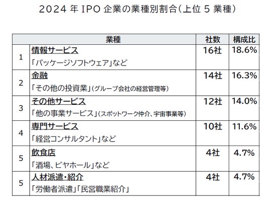 次いで、「金融」が16.3%(14社)で続いた。2024年IPO企業で初値ベースの時価総額が2番目に大きかった半導体メモリ大手のキオクシアホールディングス(東証プライム)など、持ち株会社が含まれる「その他の投資業」に属している企業が13社、「その他の貸金業」が1社だった。