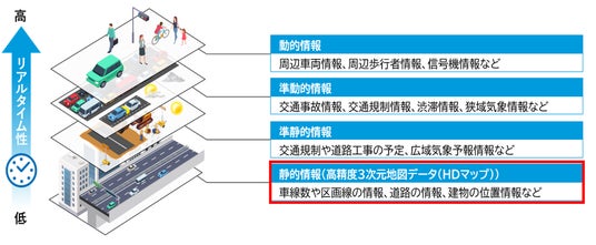 ダイナミックマップとは、情報のリアルタイム性ごとに4階層に分類された情報を持つ地図データベースの概念を指しています。ダイナミックマッププラットフォームは車線情報、路面情報等をまとめた“静的情報”の基盤となる高精度3次元地図データ(HDマップ)を提供しています。