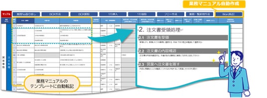 入力した作業内容の一部を、マイクロメイツオリジナルの業務マニュアル用Microsoft Wordテンプレートに自動的に反映させることで、このテンプレートを基に、業務マニュアルを簡単に作成・整形(図2)。