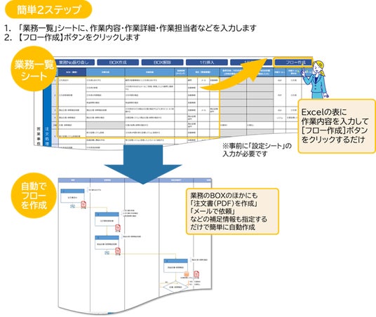 業務一覧シートに作業内容を入力し「フロー作成」ボタンをクリックするだけで、自動的に業務フローを作成し、所要時間の大幅な短縮を実現(図1)。使い慣れたMicrosoft Excelの操作だけで誰でも簡単に業務フローを作成できるため、人材育成にかかる時間とコストを削減でき、業務フロー作成の内製化を支援。また、統一フォーマットで出力されるため、作業者ごとのばらつきが発生しない。