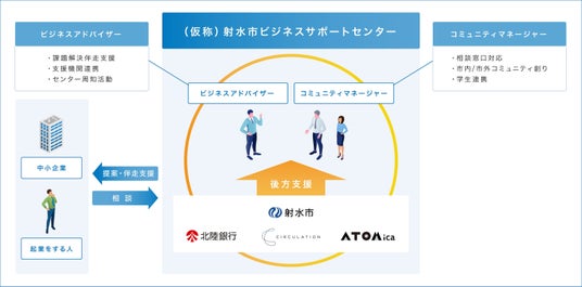 2025年4月より開設予定です。ビジネスサポートセンター内に、高い専門性を持つビジネスアドバイザーとコミュニティマネージャーを配置し、事務局となるサーキュレーション・北陸銀行・ATOMicaの3社が後方支援をすることで、スピーディーかつ実行性のある解決策を提示し、伴走型支援を行います。特に、サーキュレーションは、ビジネスアドバイザーの選定、3年間の運営に伴うフォローを中心に支援いたします。