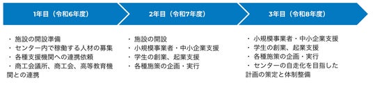 1年目となる2024年度は、施設の開設準備、センター内の人材(ビジネスアドバイザー・コミュニティーマネジャー)の選定、各種支援機関への連携依頼、商工会議所、商工会、高等教育機関との連携を行います。