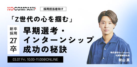 企業の人事部門向けに採用マーケティング支援を行う株式会社No Company(本社:東京都港区、代表取締役:秋山真)は、この度、自社の採用施策や内定承諾率に悩む採用・人事向けイベント「早期からZ世代の心を掴む! 選考参加に繋がるインターンシップ設計」を3月7日(金)に開催します。自社が「候補者に選ばれる」ための早期選考・インターンシップの『成功の秘訣』を、最新の新卒トレンドを交えながら解説します。