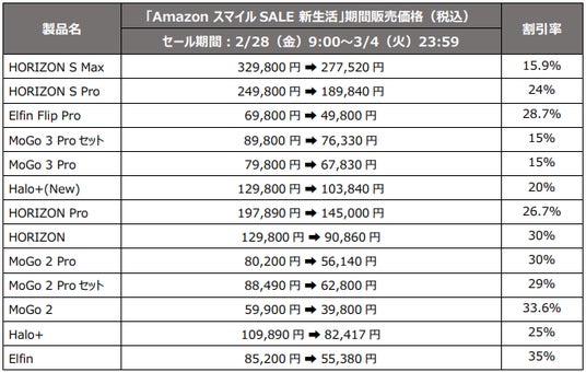 グローバルホームプロジェクター市場で出荷量世界1位※のスマートプロジェクターブランド「XGIMI(エクスジミー)」は、2025年2月28日(金)9:00~3月4日(火)23:59にわたりAmazonで開催される「Amazon スマイルSALE 新生活」にて対象製品が最大35%OFFとなるセールを実施します。対象商品は、2024年9月に発売された、IMAX Enhanced認証の4K ホームプロジェクター「HORIZON S Max」や、ポータブルプロジェクター「MoGo 3 Pro」や「Elfin Flip Pro」など、人気機種を含む全11モデルです。