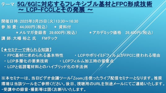 先端技術情報や市場情報を提供している(株)シーエムシー・リサーチ(千代田区神田錦町: https://cmcre.com/ )では、 各種材料・化学品などの市場動向・技術動向のセミナーや書籍発行を行っておりますが、 このたび「5G/6Gに対応するフレキシブル基材とFPC形成技術~ LCP-FCCLとその発展 ~」と題するセミナーを、 講師に大幡 裕之 氏(FMテック)をお迎えし、2025年3月25日(火)13:30より、 ZOOMを利用したライブ配信で開催いたします。 受講料は、 一般:44,000円(税込)、 弊社メルマガ会員:39,600円(税込)、 アカデミック価格は26,400円(税込)となっております(資料付)。