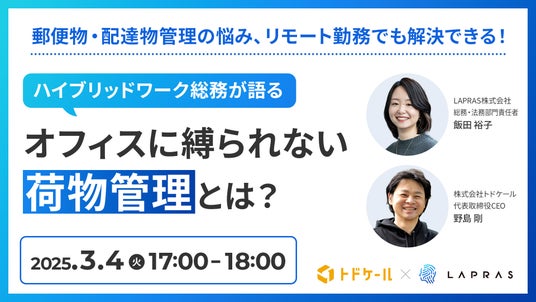 株式会社トドケール(本社:東京都千代田区、代表取締役:野島剛、以下トドケール)は、LAPRAS株式会社(所在地:東京都渋谷区、代表取締役:染谷健太郎 以下、LAPRAS社)と共催で、2025年3月4日(火)17:00より、オンラインセミナー「ハイブリッドワーク・フルリモート環境でも“郵便・配送”に困らない! ~LAPRAS社に聞く、クラウドメール室のリアル活用事例~」を開催いたします。本イベントはどなたでも参加が可能です。