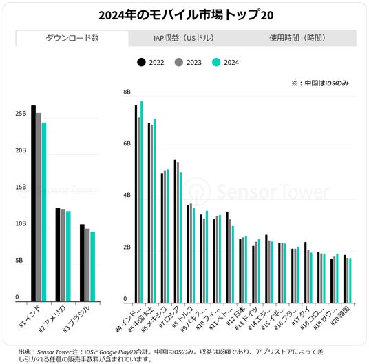 ダウンロード数と使用時間の伸びは多くの既存市場で鈍化していますが、収益成長の可能性はほとんど衰えていません。IAPと有料アプリおよびゲームによる収益は、2024年にiOSとGoogle Playを合わせて1,500億ドルに達し、前年比13%増という驚異的な伸びを見せました。この成長の大部分は前年比23%増の非ゲームが牽引しており、一方のゲームは2年連続の減少を経て同4%増と見事に回復しました。