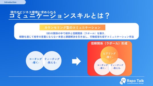 Actors合同会社(本社:東京都渋谷区)は、新卒から管理職まで各従業員のコミュニケーションスキル向上を支援する研修プログラム『ラポトーク -Development-』をリニューアルいたしました。