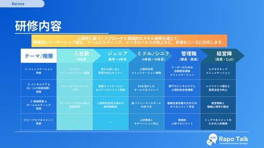 今回のリニューアルでは、階層別研修(内定者、新卒、シニア、管理職、経営陣)やテーマ別研修(コミュニケーション、メンタルケア、チームビルディング、ピープルマネジメント)など、多彩なプログラムを新たにご用意し、企業様の多様なニーズにお応えできる内容となっております。