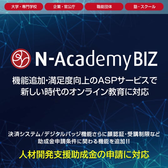 小規模運用可能なASP型eラーニングシステムです。決済システム/デジタルバッジ機能さらに顔認証・受講制限など助成金申請条件に関わる機能を追加。既成コンテンツの提供も対応可能です。