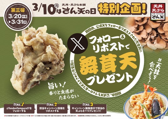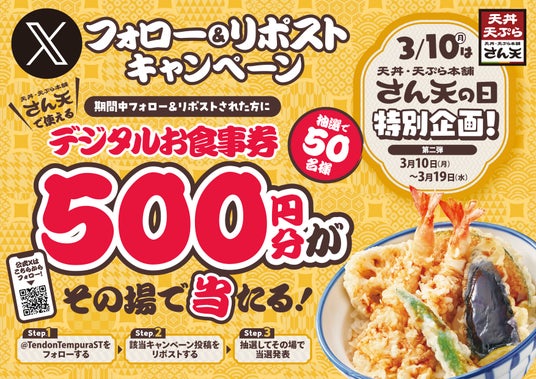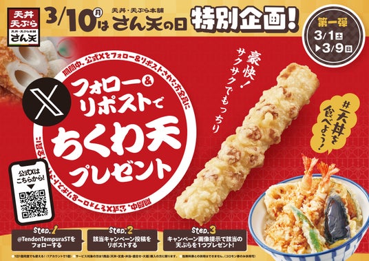 サトフードサービス株式会社(本社・大阪府大阪市、代表取締役社長・杉本 貴之)が運営する「天丼・天ぷら本舗 さん天 」では、2025年3月1日(土)~3月31日(月)まで、公式Xでキャンペーンを第一弾~第三弾まで3回に分けて実施いたします。どのキャンペーンも公式Xアカウントをフォローし、キャンペーン投稿をリポストすることで、簡単に参加できます。特に、第一弾・第三弾では、期間中に何度でも揚げたてサクサクの天ぷらがもらえる大変お得なキャンペーンです。この機会にぜひご参加ください。