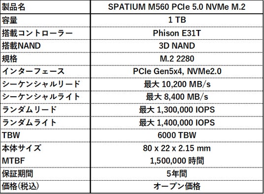 【SPATIUM M560 PCIe 5.0 NVMe M.2 1TBの主な特徴】