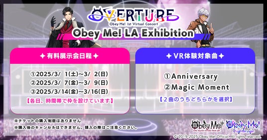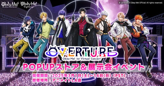 今回の展示会では、昨年7月に開催された北米最大のアニメイベント「Anime Expo(R)」のバーチャルライブ映像のVR体験、メッセージボード、パネル、ライブ本編の名シーンを集めた壁画展示、ライブ映像上映、グッズ販売を行います。また、入場者特典として、ここでしか手に入らないObey Me!ブロマイドをプレゼントいたします。