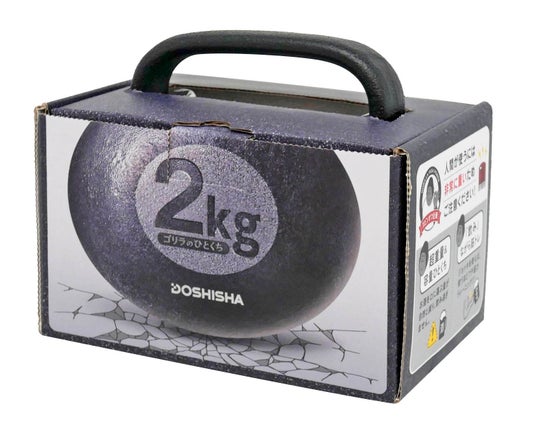 店頭で重さを実感しやすいようにハンドルが飛び出したパッケージです。正面には大きく2kgと書いてあり、重量感を示しています。また、「※ダンベルではなくジョッキです(笑)」「人間が使うには非常に重いためご注意ください!」と記載し、一般的なジョッキの重さではないことを表現しています。