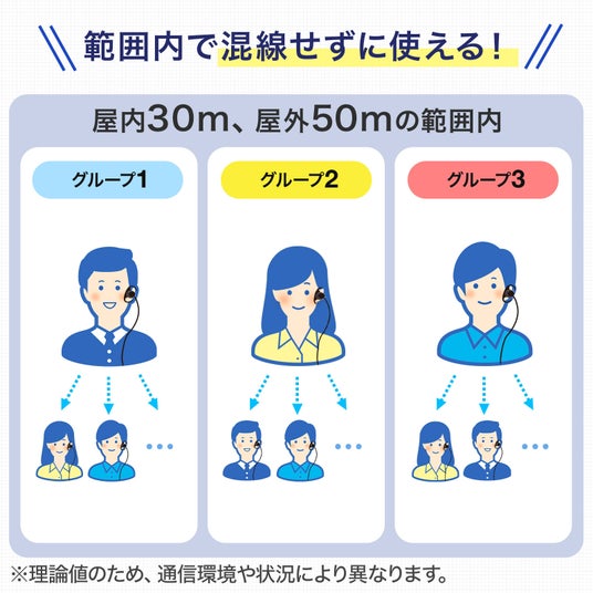 2.4GHz接続でノイズの少ない安定した音声通信が可能なので、距離が離れていても使用できます。(屋内約30m、屋外約50m以内)