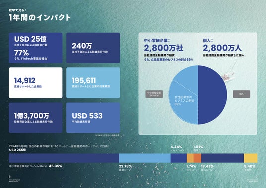 主な実績として、2024年3月31日までの1年間で、当社子会社による融資実行件数は240万件に達し、当社の提携金融機関を通じて2,800万の中小零細企業と2,800万人の個人に融資を提供しました。また、新たにブラジルとメキシコの子会社に共通のインパクト・フレームワークを導入し、より一層のポジティブインパクトの最大化を目指しています。