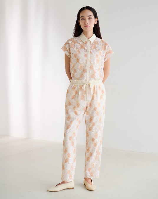 7月発売予定:74グループレースに描いたのは、太陽に向かって伸びる、いきいきとした野花の生命力。美しいランダムなステッチと、しっかり縁取りされた曲線で、繊細さと力強さを表現しています。透け感のあるチュールのラインと、きらりと輝くサテン生地とのコントラストは、肌にあてるとモダンな印象。ランジェリーに加え、カフタン風のワンピースとTシャツも揃えています。