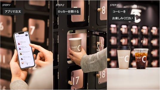 「root C」はアプリから時間を指定して注文することで、お客さまの受け取りたい時間に合わせて挽きたて、淹れたてのスペシャルティコーヒーを専用のロッカーから提供する、完全無人営業のコーヒースタンドです。ユーザーは「root C」の前で待つことなく、移動途中に注文も可能。パーソナライズ診断 root C MATCH(TM) を利用して、ライフスタイルや嗜好に合わせたコーヒーをご提案します。2021年グッドデザイン賞受賞。日経トレンディ2022年ヒット予測ランキング4位「次世代自販機」の1つとして選出。