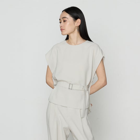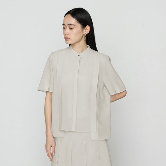 - 身頃と袖に施したシャープなラインのタックがスマートな印象です。タックを途中からふらしにすることで、エアリーで涼し気な仕上がりにしました。