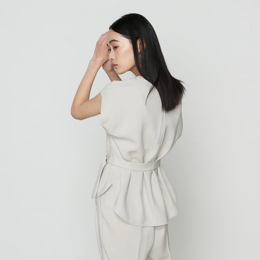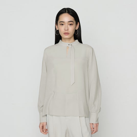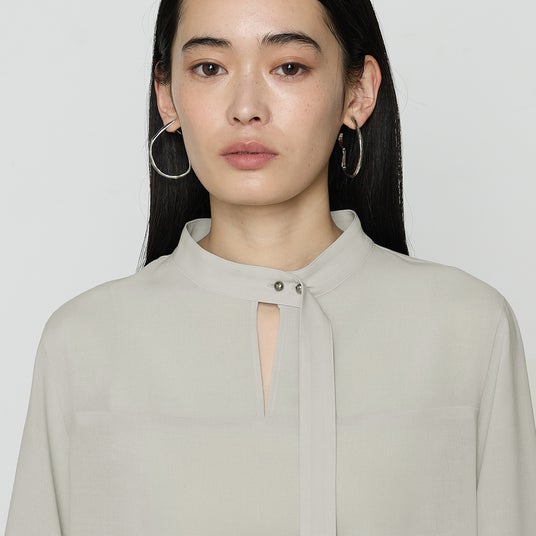 - 首元のカットアウトで抜け感を演出しながら、襟のメタルボタンで全体を引き締めたデザインです。アシンメトリーなタイがポイントで、タイがあることにより上品な印象に仕上げています。