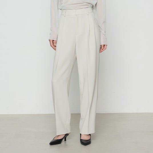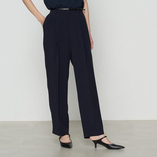 - 2タックの程良い分量です。素材によるキレイな落ち感がポイントで、脚長効果があるシルエットです。前側はタックとセンタープレスで縦のラインを強調し、より脚を真っ直ぐに長く見せてくれます。
