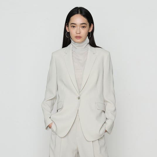 - ミニマルなノーカラージャケットで、シャープでありながらも上品な印象です。ボタンを開けて着た際もキレイなシルエットが保たれるので、きちんとしたシーンでは留めて、カジュアルなシーンでは開けるなど、様々な場面で活躍します。