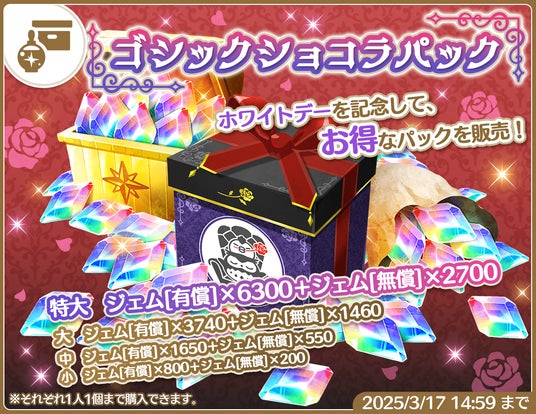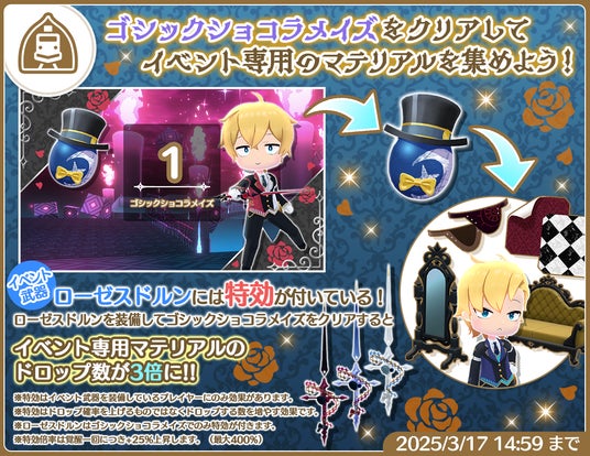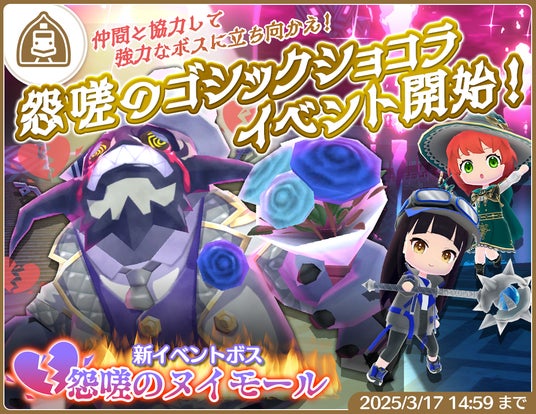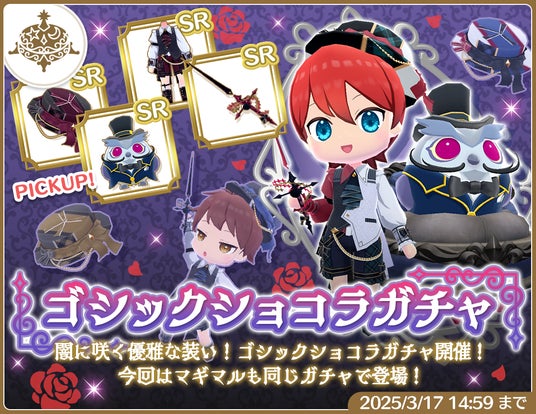 バレンタインにチョコをもらえなかった怨嗟のボス「ヌイモール」が登場するイベントクエスト、イベント専用マテリアルがもらえる「ゴシックショコラメイズ」クエスト、ゴシックショコラコーデやマギマルが楽しめるピックアップガチャを期間限定でお楽しみください。
