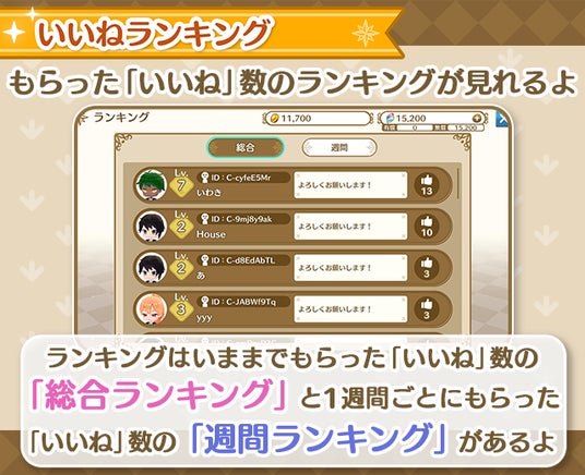 他のプレイヤーのルーム訪問時に、お部屋に対して【いいね】ができるようになります。【いいね】数の累計の総合ランキングや、週間ランキングも是非チェックしてください。