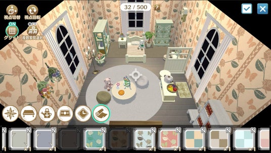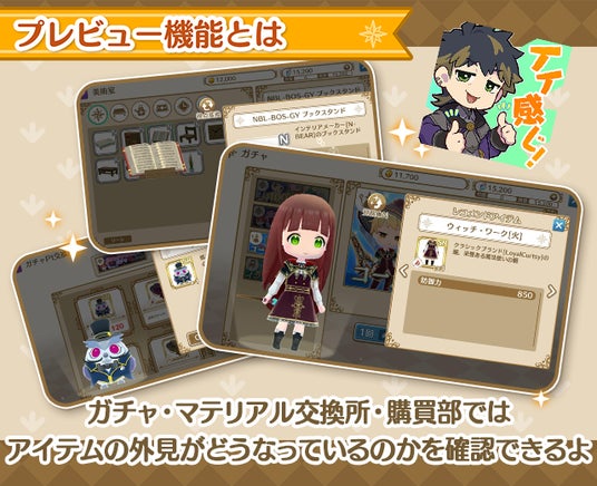 ガチャ、交換所、ショップでアイテムをタップすると、プレビューが表示されます。アイテム交換・購入前に、気になるインテリアの確認や、コーデの試着ができます。