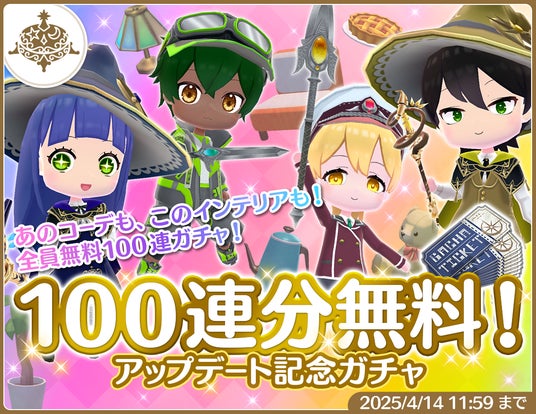 『マギマルと魔法使いの学園』では、4月14日11:59までの期間限定で100連分無料のアップデート記念ガチャを実施します。この期間に是非アプリをダウンロードして、コーデやインテリアをお楽しみください。