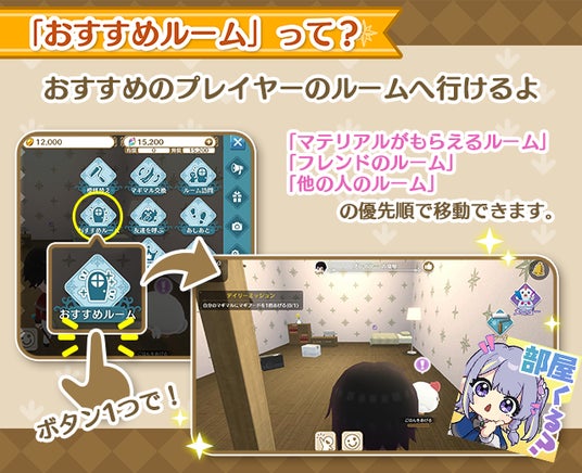 ボタン一つでおすすめのプレイヤーのルームに移動可能になります。「マテリアルがもらえるルーム」、「フレンドのルーム」、「他のプレイヤーのルーム」の優先順でお部屋へ移動ができます。