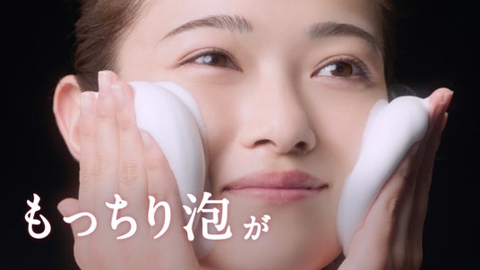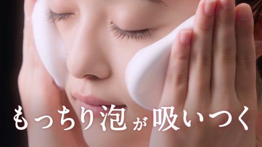 新CMではポンプを押すだけで出てくる「美容液成分高配合*3 生クリーム泡」の魅力を紹介しています。ポンプからたっぷりの濃密な生クリーム泡を手に出すところからはじまり、井上さんが、もっちりした泡を顔に広げていく様子、洗顔後の納得のしっとり肌を体感する様子を描いています。