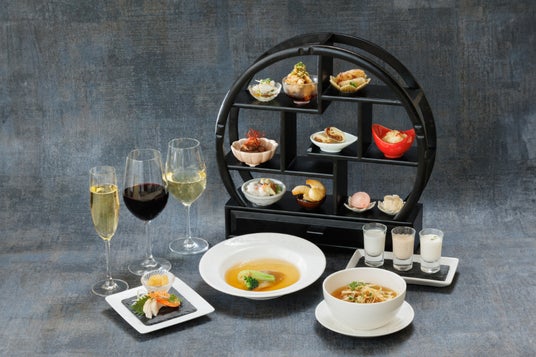 ディナーには、フカヒレにじっくりと時間をかけてスープの旨みを凝縮させた「小フカヒレ姿 醤油味」に加え、「北京ダック」や「旬野菜炒め 蟹肉あんかけ」、「豚スペアリブのトウチ蒸し」など、中国茶とのペアリングはもちろん、オプションのお酒にも合うメニューをお届けいたします。ドリンクオプションには、乾杯用ノンアルコールスパークリングワイン1杯とソフトドリンク4種飲み放題のプランと、ワイン3種を各1杯ずつお愉しみいただけるプランをご利用いただけます。女子会やご友人とのお集まり、自分へのプチご褒美として、心から満たされるグルメなひとときをお過ごしください。