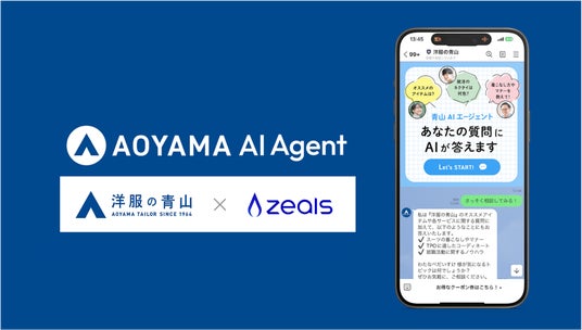 接客AIエージェントを提供する株式会社ZEALS(所在地:東京都目黒区、代表取締役:清水正大、以下「ジールス」)は本日、青山商事株式会社(本社:広島県福山市、代表取締役社長:青山理)に「ZEALS AI Agent」を導入し、LINE公式アカウント上で「青山AIエージェント」プロジェクトを始動したことをお知らせ致します。
