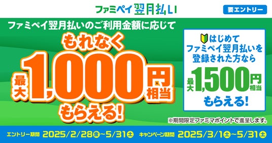 さらに!本キャンペーンにエントリーを行い、キャンペーン期間中にはじめてファミペイ翌月払いにお申込みの上登録完了されると、後日もれなく500円相当を進呈いたします。