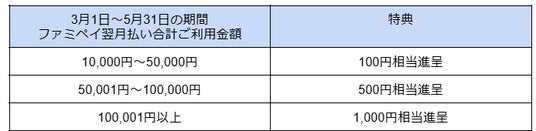 本キャンペーンにエントリーを行い、キャンペーン期間中のファミペイ翌月払いご利用合計金額に応じて、後日最大1,000円相当をもれなく進呈いたします。