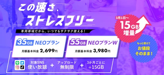 ソニーネットワークコミュニケーションズ株式会社は、モバイル通信サービス「NUROモバイル」において、3月1日より、月額基本料金は据え置きで「NEOプラン」と「NEOプランW」のデータ容量を15GB増量します。これにより、「NEOプラン」は35GB・2,699円、「NEOプランW」は55GB・3,980円で利用可能になります。