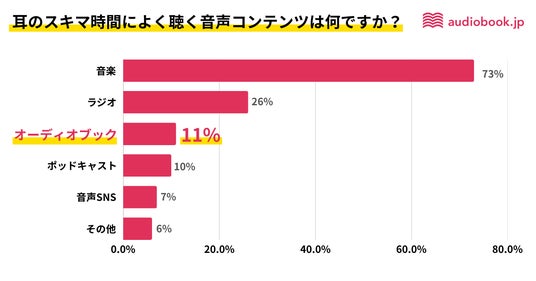 耳のスキマ時間(※3)によく聴く音声コンテンツを問うと、1位が「音楽」73%、2位が「ラジオ」26%。3位「オーディオブック」は11%で、「ポッドキャスト」10%を上回る結果となりました。オーディオブックが、日常で聴く音声コンテンツとして馴染みつつあることがわかります。