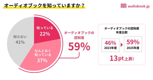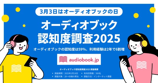 3月3日は「オーディオブックの日」です。オーディオブック書籍ラインナップ数No.1(※1)の「audiobook.jp」を運営する株式会社オトバンク(本社:東京都文京区、代表取締役社長:久保田裕也、以下「オトバンク」)は、この「オーディオブックの日」にちなみ、「オーディオブック認知度調査2025」を実施しました。オーディオブックの認知度は59%、利用経験は15%という結果で、2023年の調査と比較すると、それぞれ13ポイント、6ポイント上昇しており、2年前よりもオーディオブックが世の中に浸透してきていることがわかりました。