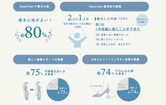 約80%の人が「履き心地がよい」と回答、また、2人に1人が足のお悩みが一つ以上解決したと回答しました。さらに、Sapofeetの特徴である「美しい姿勢サポートの実感」「日本人にフィットしやすい足型」についてもそれぞれ、約75%・約74%の人が実感したと回答しました。