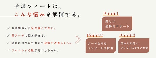 「姿勢よく歩ける」「自然と背筋が伸びる」「衝撃の吸収力が高い」「履いた感触がふわふわ」等の機能性を実感する声に加え、「高級感がある」「仕事でも使いやすい」「形がとても綺麗」等、デザイン性の高さに関する声も多く寄せられました。