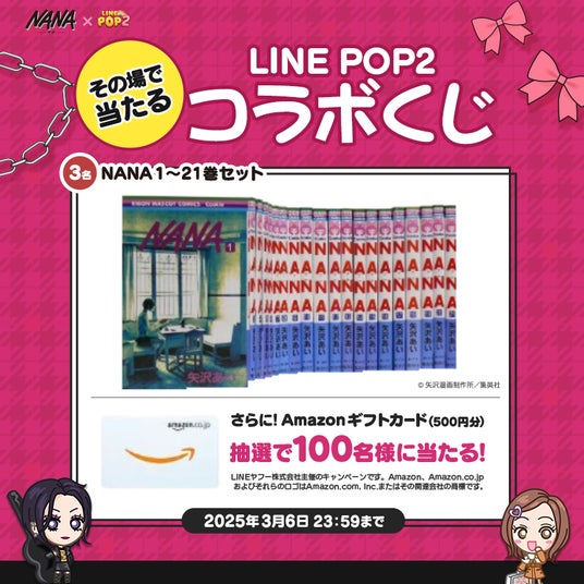 コラボを記念して、POP2公式X(旧Twitter)でインスタントウィンキャンペーンを実施します。今回は『NANA』のコミックス1~21巻セットやAmazonギフトカード、他にもコラボ限定ミニモンボックスなどのゲーム内アイテムがその場で当たります。