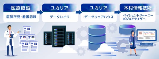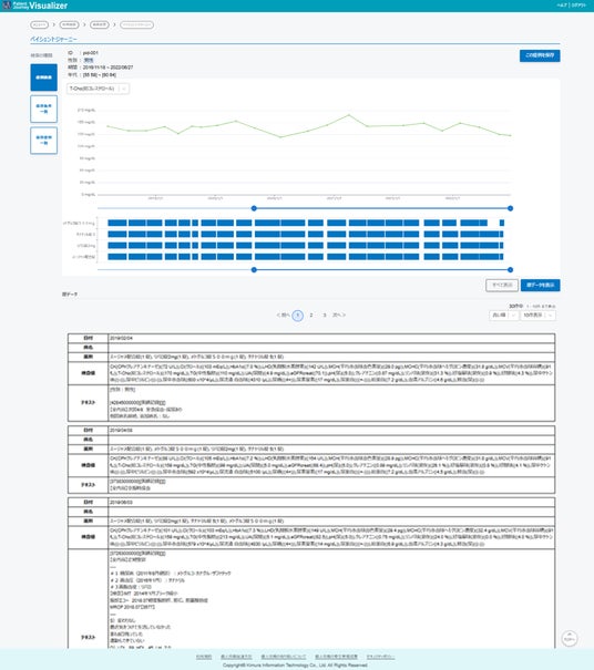 「Patient Journey Visualizer」は、ユカリアが構築した電子カルテデータベース「ユカリアデータレイク」内に蓄積されている検査値や投与薬剤、実際の症例などのデータを視覚的に理解しやすいグラフの形で閲覧可能なサービスであり、ユカリアと木村情報技術が共同開発しました。実際の症例をペイシェントジャーニーとした検索結果をご覧いただくことが可能であり、製薬企業のユーザーの方々に新たな「気付き」を提供するなど、製品開発戦略の策定に貢献します。また、MR(医療情報担当者)の研修資料のベースとしてもご利用いただけます。