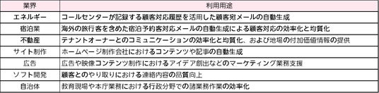 「Rakuten AI for Business」は現在、サービスのトライアルも実施しております。既に、幅広い法人のお客様にご利用いただいており、サービス業や情報通信業だけでなく、宿泊業、医療業界、自治体など、様々な業種での活用が期待されています。各業界での利用用途と実際にご利用いただいた感想コメントを一部ご紹介いたします。