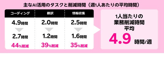 楽天モバイルでは様々な業務の中でAIを活用していますが、 「コーディング」「翻訳」「情報収集」が特に社内で削減時間のインパクトが大きいタスクとなっており、コーディングにおいては44%もの時間を短縮することができています。様々なタスクの掛け合わせにより、楽天モバイルは1人当たり毎週平均4.9時間もの業務時間を削減できるようになりました(注1)。